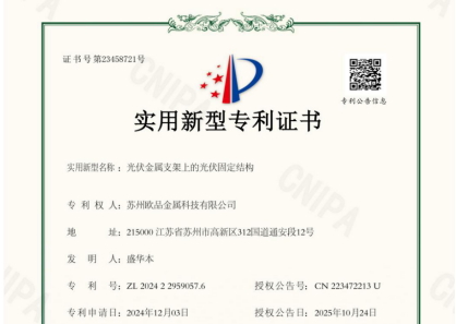 欧品金属获光伏支架固定结构实用新型专利