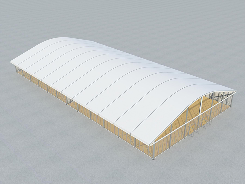 华烨篷房负责人介绍说,记得当时客户来找的时候提出需要采购篷房并且要容纳2000人到3000人,还要有隔断。华烨给的初步设计方案为弧形顶篷房,跨度30米,长度60米,屋檐高度4米,边墙一半为透明玻璃墙,一半遮光用到的是硬体ABS板墙体。也根据客户的要求中间增加一个隔断,将篷房一分为二。 另外这座篷房搭配了6套双开玻璃门,便于人员进出。