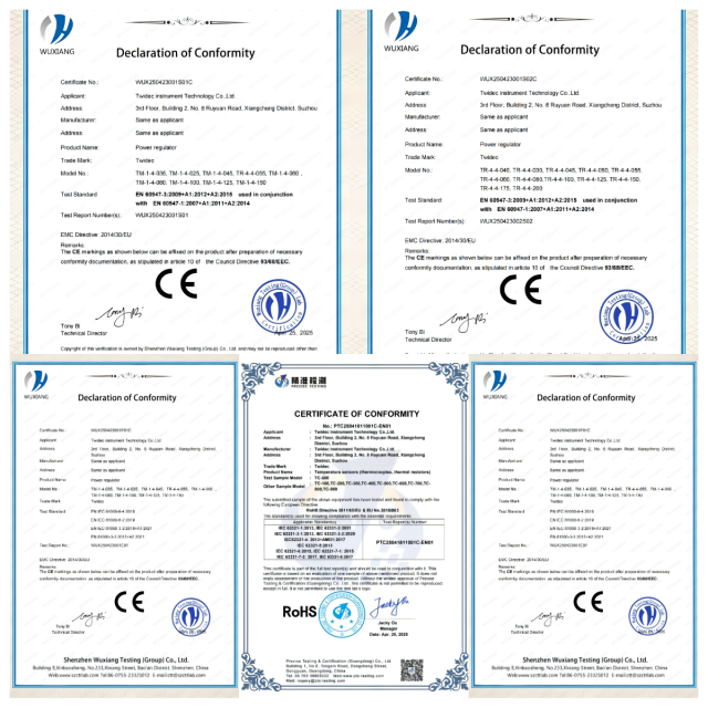 据了解,此次合泉仪表通过认证的产品包括TC系列温度传感器(型号TC-100至TC-900)和TR/TM系列电力调整器(三相TR-4-4-030至TR-4-4-200、单相TM-1-4-025至TM-1-4-150)。其中,温度传感器通过RoHS 2011/65/EU及修订指令EU 2015/863的严苛测试,重金属及有害物质含量(如铅、镉、汞)均低于0.1%,符合半导体、医疗设备等高精度场景需求;电力调整器则通过EN 60947-1/EN 60947-3标准认证,验证其在工业场景中的电气安全性与机械稳定性,同时满足EN IEC 61000系列电磁兼容性标准,抗干扰能力与电磁辐射控制达行业优秀水平。
