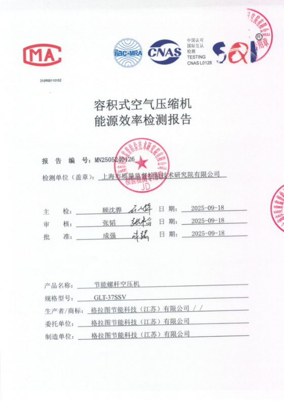 在工业4.0的浪潮中,绿色制造已成为时代的主旋律。近日,格拉图节能科技(江苏)有限公司凭借其在节能技术上的突破性创新,多款空压机在经过国家权威检测机构的严苛评测与层层筛查后,能效指标达国家一级能效标准,正式荣获由国家权威机构颁发的“一级能效认证”。这一殊荣不仅是对格拉图空压机出色性能的肯定,更标志着其产品在向更高能效、更低碳排放方向迈进的征程上,迈出了坚实而关键的一步。
