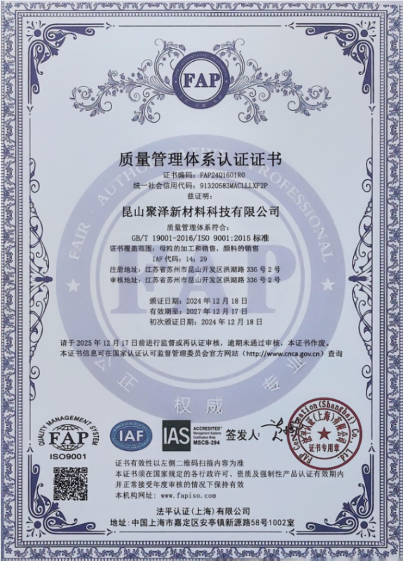 在日常运营中,昆山聚泽新材料已将ISO9001体系要求深度融入业务全流程。公司持续在原料入库环节对钛白粉、载体树脂等实施批次检验与留样管理;在生产环节,对挤出工艺参数进行实时监控与标准化操作记录;在成品出厂前,坚持使用专业仪器进行色差、分散性等关键指标的最终检测,确保了产品质量的可追溯性与稳定性。